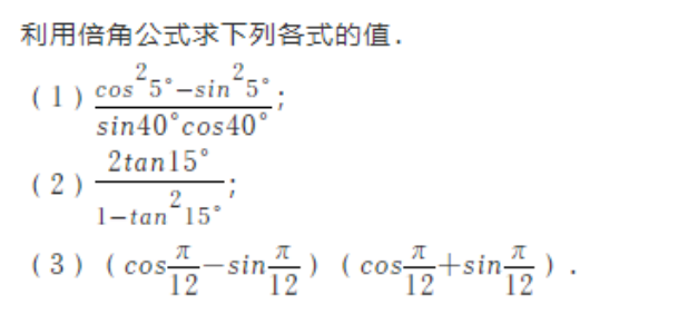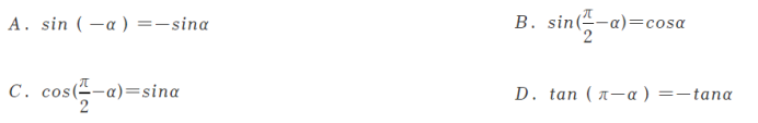 1.三角函数和角变换基本公式: sin(A+B)= sinAcosB+cosAsinB 2.下面对cos(A+B) = cosAcosB-sinAsinB; 来进行推导: 如上图,已知单位圆中,∠AOD为α,角AOB为β, 求证:cos(α+β)=cosαcosβ-sinαsinβ; 证明:由角的定义可知D,A,B三点坐标分别为(1,0),(cosα,sinβ),(-cos(α+β),sin(α+β)); 在O点引一条线,交圆O于C,使得∠COD为-β,则D点坐标为(cosβ,-sinβ); 即可得∠BOD=∠A0C; 由同一圆心角所对的弦长相等得,AC=BD; 坐标代入得:(cosα-cosβ)^2+(sinα-(-sinβ))^2=(-cos(α+β)-1)^2+(sin(α+β)-0)^2; 展开得:-2cosαcosβ+2sinαsinβ+2=-2cos(α+β)+2; 整理得:cos(α+β)=cosαcosβ-sinαsinβ,即原式成立。 1、二倍角公式:sin2α=2sinαcosα,tan2α=2tanα/(1-tan^2(α)), cos2α=cos^2(α)-sin^2(α)=2cos^2(α)-1=1-2sin^2(α)。 2、半角公式:sin^2(α/2)=(1-cosα)/2,cos^2(α/2)=(1+cosα)/2,tan^2(α/2)=(1-cosα)/(1+cosα),tan(α/2)=sinα/(1+cosα)=(1-cosα)/sinα。 1.由正弦的和角公式sin(α+β)=sinαcosβ+cosαsinβ与正弦二倍公式sin2α=2sinαcosα. 求①sin3α= (用sinα表示); 2. 3. 三角函数y=-3sinx+1的最大值和最小正周期分别为( ) A.-2,2π B.4,2π C.-2,π D.-4,π 4.下列三角函数的诱导公式正确的有( )